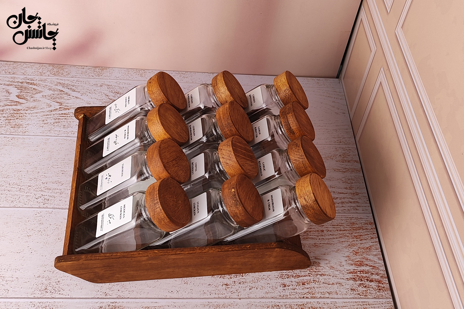 در این بسته، ۱۲ عدد شیشه مککارتی سایز ۲ با درب چوبی (هماهنگ با رنگ استند) قرار دارد که ظاهر شیک و کیفیت فوقالعادهای در نگهداری ادویهها دارند. شیشهها کاملاً مناسب نگهداری طولانیمدت ادویه بوده و از رطوبت و بو گرفتن جلوگیری میکنند.