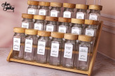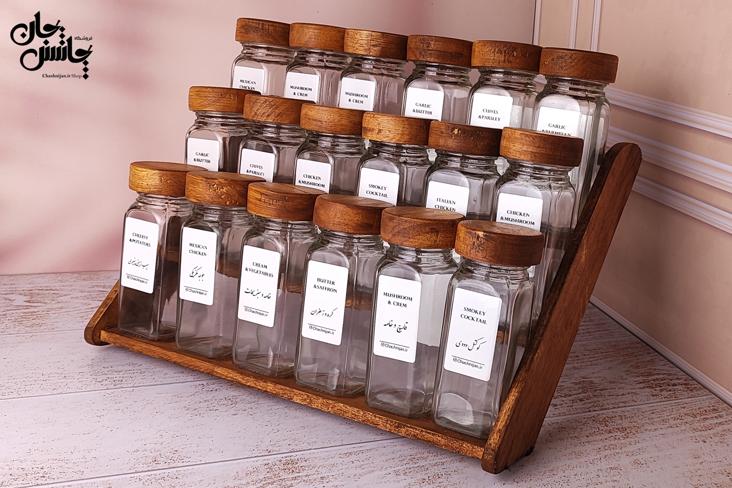 پک استند چوبی 18 تایی +18 عدد شیشه مک کارتی سایز ۲ با درب چوبی +18 عدد لیبل